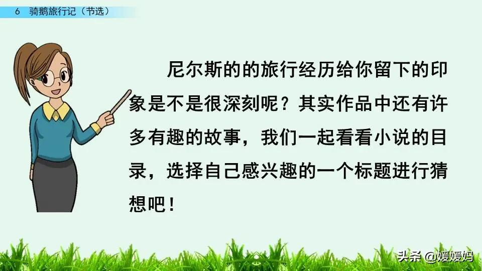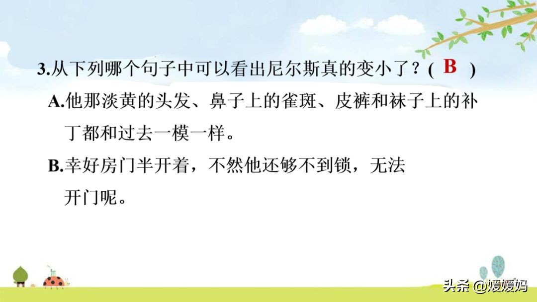 问题归纳:1.结合课文内容,说说作者是怎样表现尼尔斯变小后的模样的。作者没有直接描写男孩尼尔斯变成小人儿后的模样,而是通过间接的对比描写来表现的。如“他还够不到锁”“快看拇指大的小人儿尼尔斯·豪尔耶松”。这样描写可以让读者对尼尔斯的小有着具体直观的感受,可以激发读者的阅读兴趣。