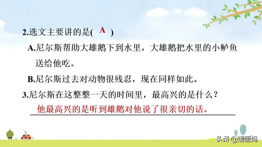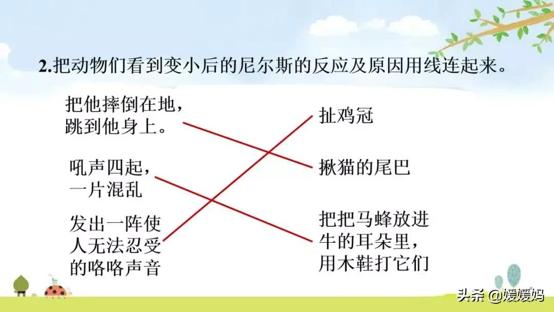 2.动作 语言 尼尔斯为了救下被咬的野鹅,与狐狸进行殊死搏斗的勇敢、善良的品质