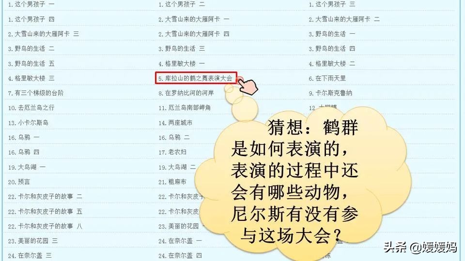 “鶴之舞表演大会”主要讲述了在大雁阿卡的帮助下,尼尔斯来到了库拉山,参加每年都要在这里举行的游艺大会。在表演大会上他见识了乌鸦的飞行舞、山兔的表演、大松鸡的啼鸣、马鹿的角斗、大雁的表演……同时,企图破坏表演大会的狐狸斯密尔也受到了“惩罚”。