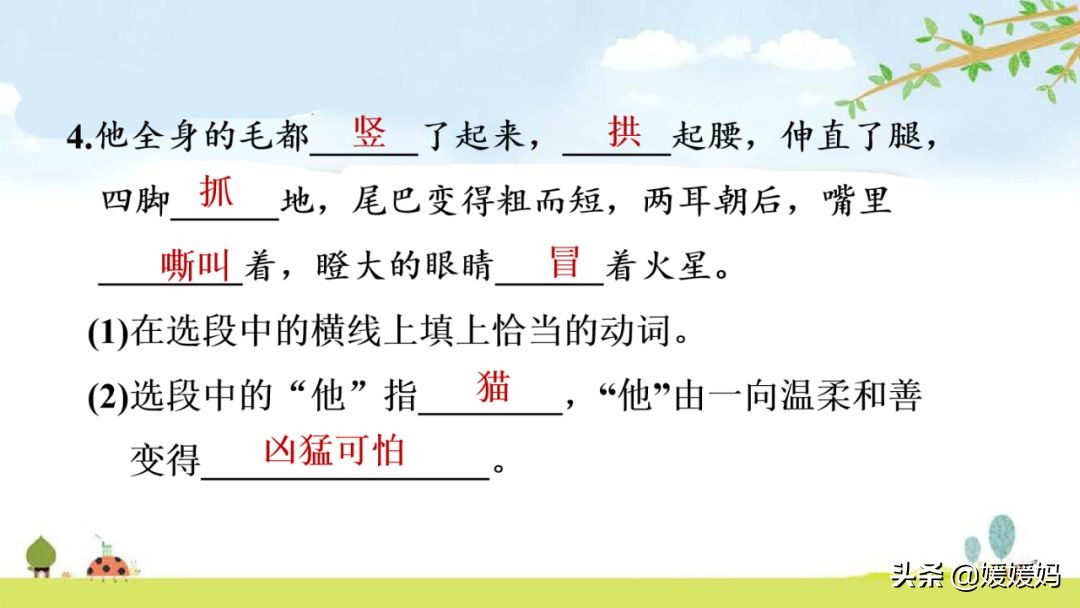4.男孩感觉到猫的爪子穿过他的背心和衬衣,刺进了他的肉皮,锋利的犬牙触到了他的咽喉上。他拼命地喊着救命。说明男孩习惯了欺负猫,总是扯它的尾巴。愤怒使男孩早已忘记自己变成拇指大小之后是多么弱小无力。在被猫扑倒在地,前爪按住胸口,大嘴对准咽喉之后,又害怕猫要了他的命,所以大喊救命。说明男孩此时已经被吓坏了。