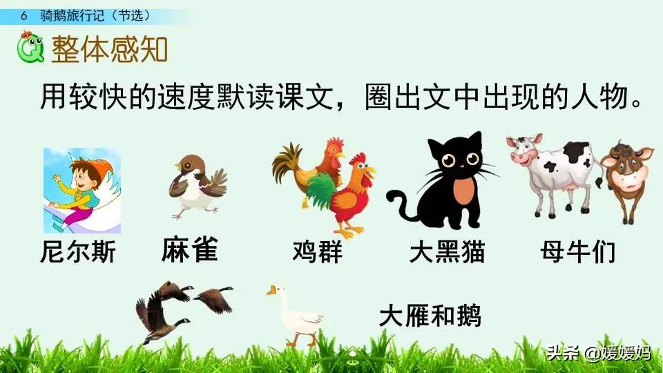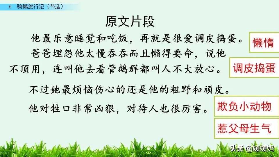 课文主题:课文主要写了喜欢虐待动物的小男孩尼尔斯被小狐仙变成大拇指般大小后受尽动物们的嘲笑、恐吓和追逐。后来,尼尔斯被雄鹅带到了天上,开始了骑鹅旅行,为我们展现了一个曾经喜欢虐待动物、喜欢搞恶作剧的男孩的形象。
