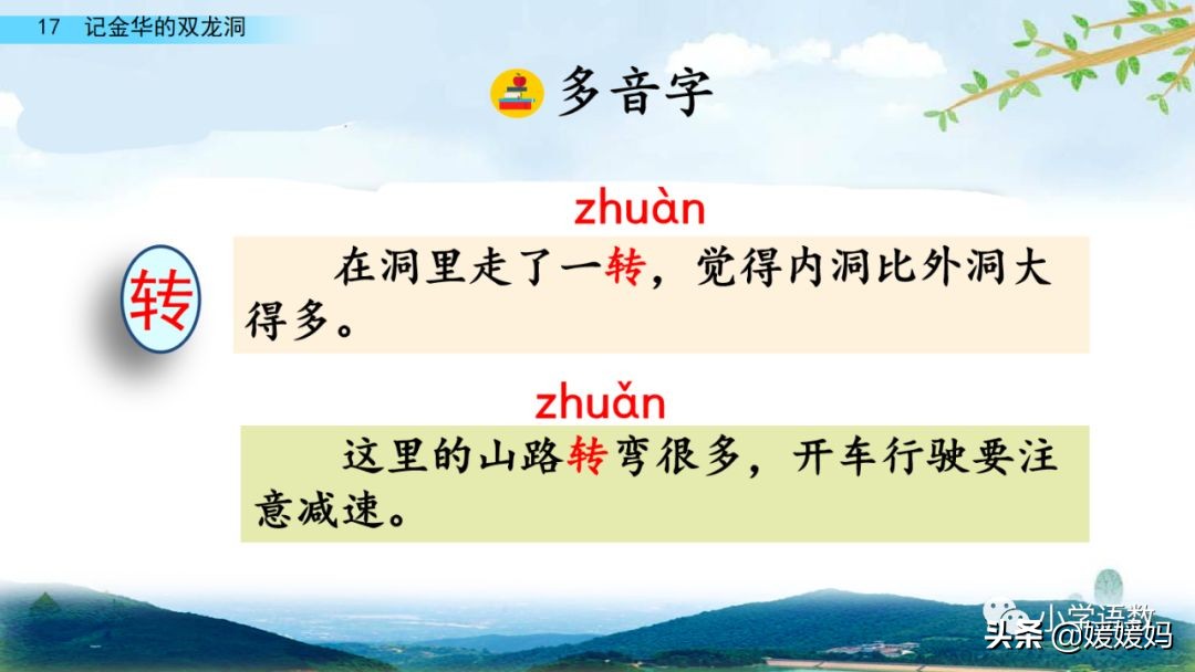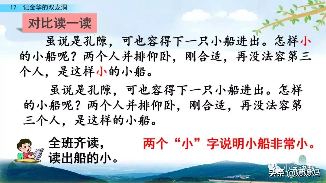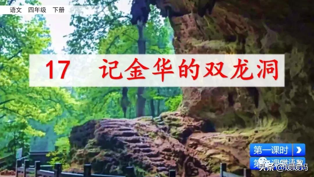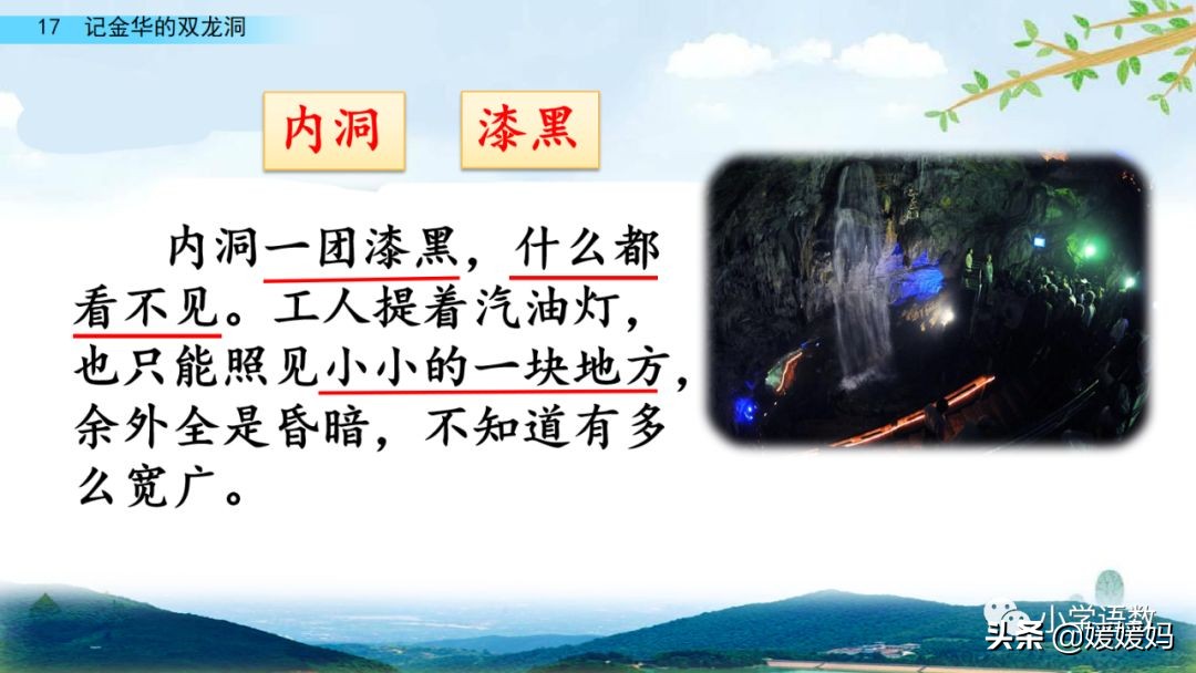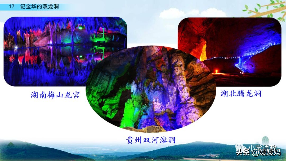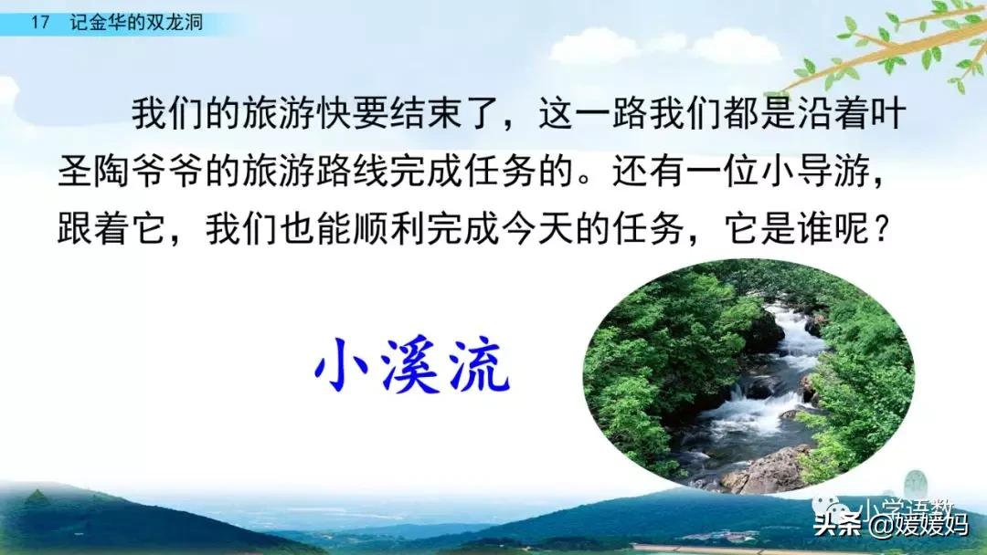 一个“迎”字,点明作者是逆溪流而上。“时而……时而……”运用排比句式,说明了溪流蜿蜒曲折,由于溪流的宽窄不一,才形成流水速度的缓急不同,作者巧妙地运用“宽、窄;缓、急”两对反义词准确地表达溪流的形和声。由于溪流缓急不一,听到的流水声也就各不相同,犹如在“时时变换调子”。这句话烘托了作者当时的游兴有多浓,对涓涓溪流发出如此赞叹!第一句话说明了双龙洞周围的地势环境,使读者有身临其境之感。第二句话则点明了双龙洞的准确位置,同时也为作者开始参观双龙洞起了过渡作用。