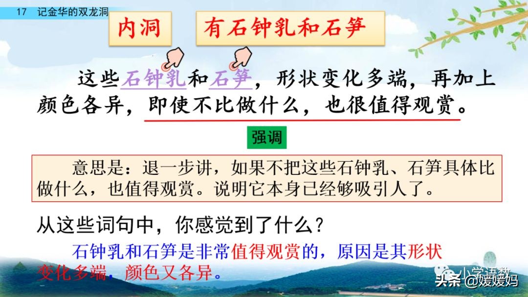 4.文中画线的部分让我们体会出:石钟乳和石笋很值得观赏,不需要比做什么,也很好看。