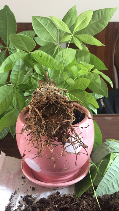 换盆的时候你就会发现,发财树它的根系是非常细小非常弱的,如果你把这么弱的根系,闷在一个大的花盆里,用很多的土壤还不太透气,这样肯定是把发财树置于死地了,咱们养发财树,就用原来小的花盆营养土就可以,不用换盆,这样后期的养护不会出现什么问题。