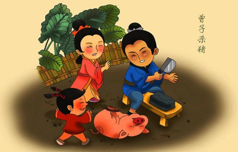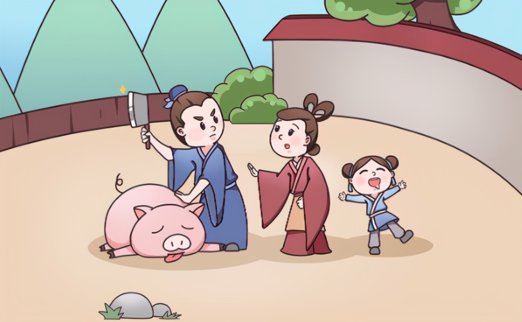 曾参的妻子从集市上回来后,小孩子要吃肉。曾参就磨刀,准备去杀猪!他的妻子就说“我不过是想糊弄一下小孩子啊,那能就这么就把咱们家的猪杀了呀!”