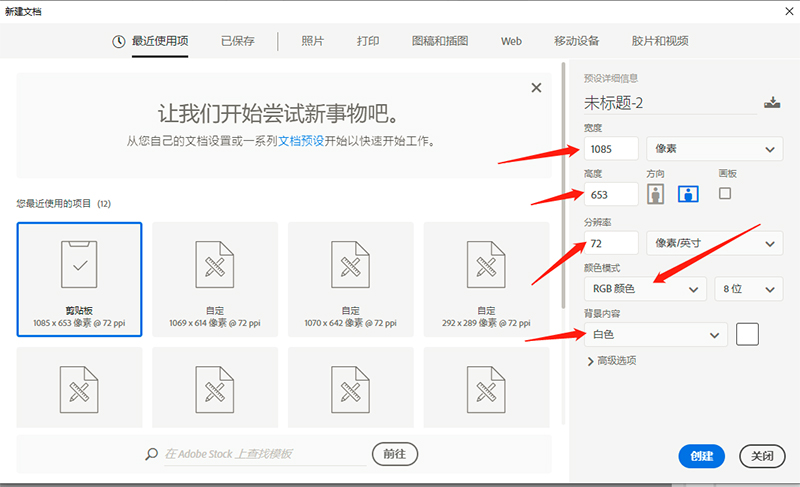 【预设】 在该下拉列表框中选择自定义选项,就可以在下方自定义文件的大小,用户也可以直接用Photoshop中提供的预设值;
