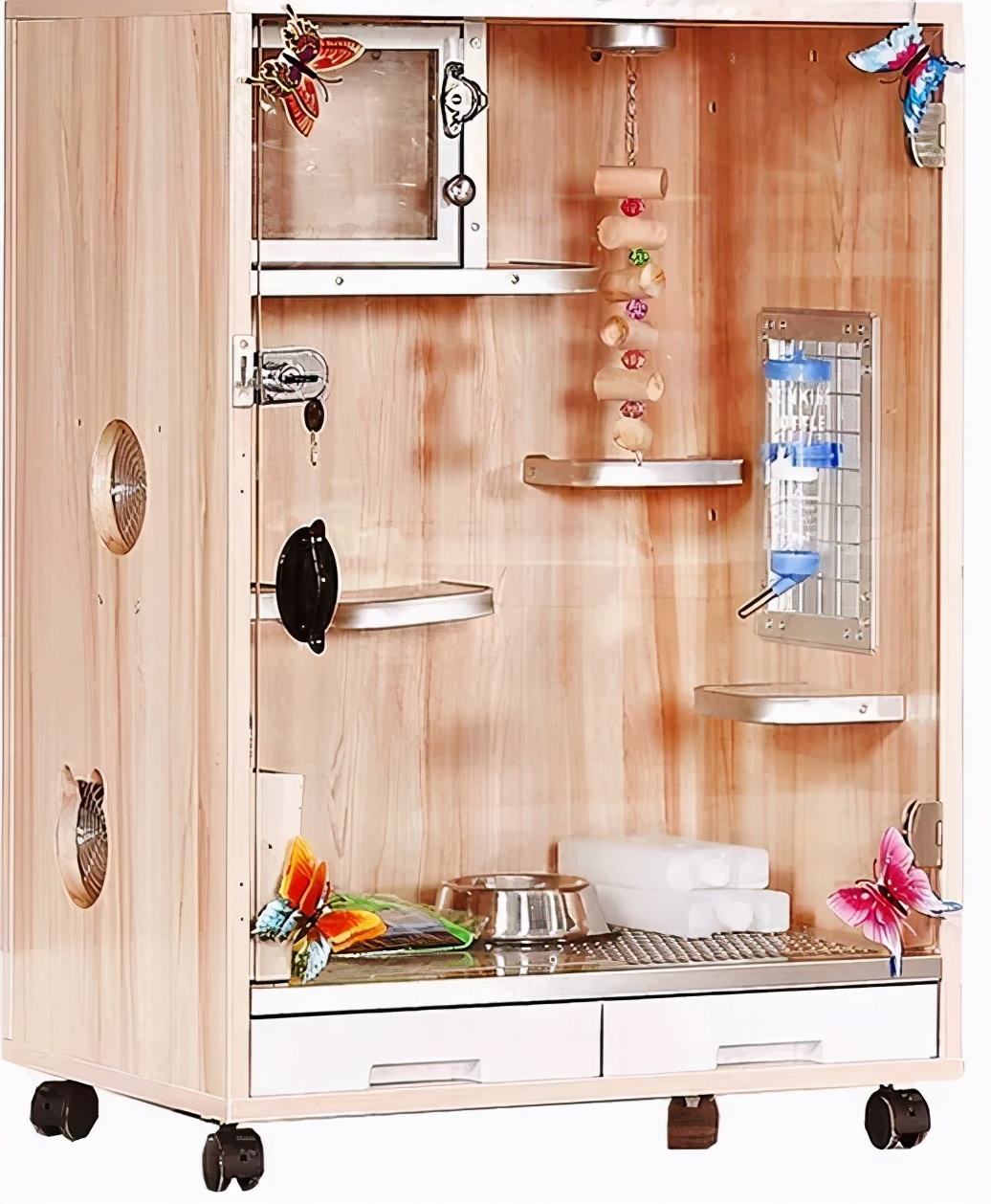 由于龙猫爱跳的特点,饲养龙猫最好准备多层的笼子,上面放窝,下面一层放食碗、水壶、草架、厕所等,中间多装一些跳板。