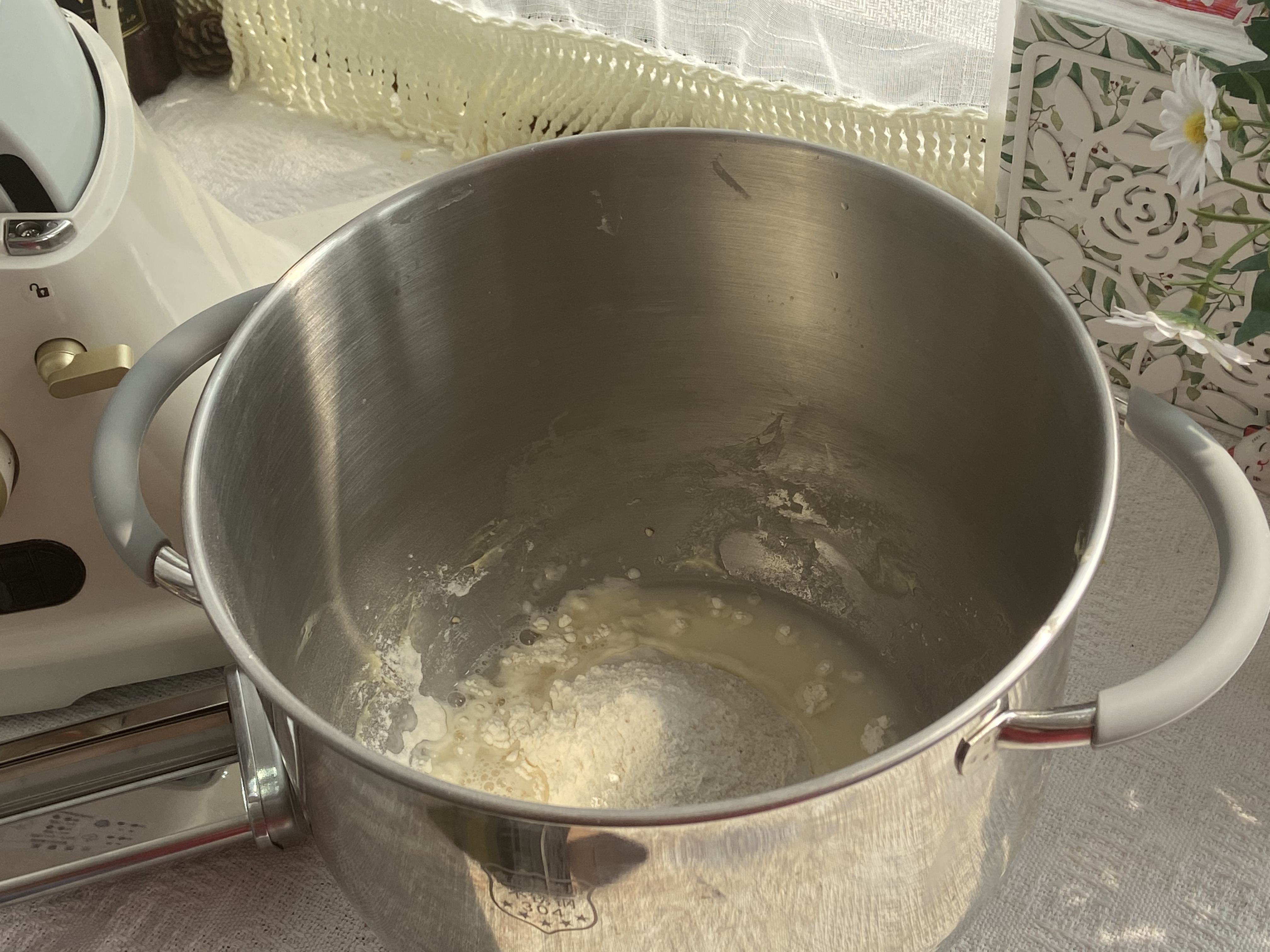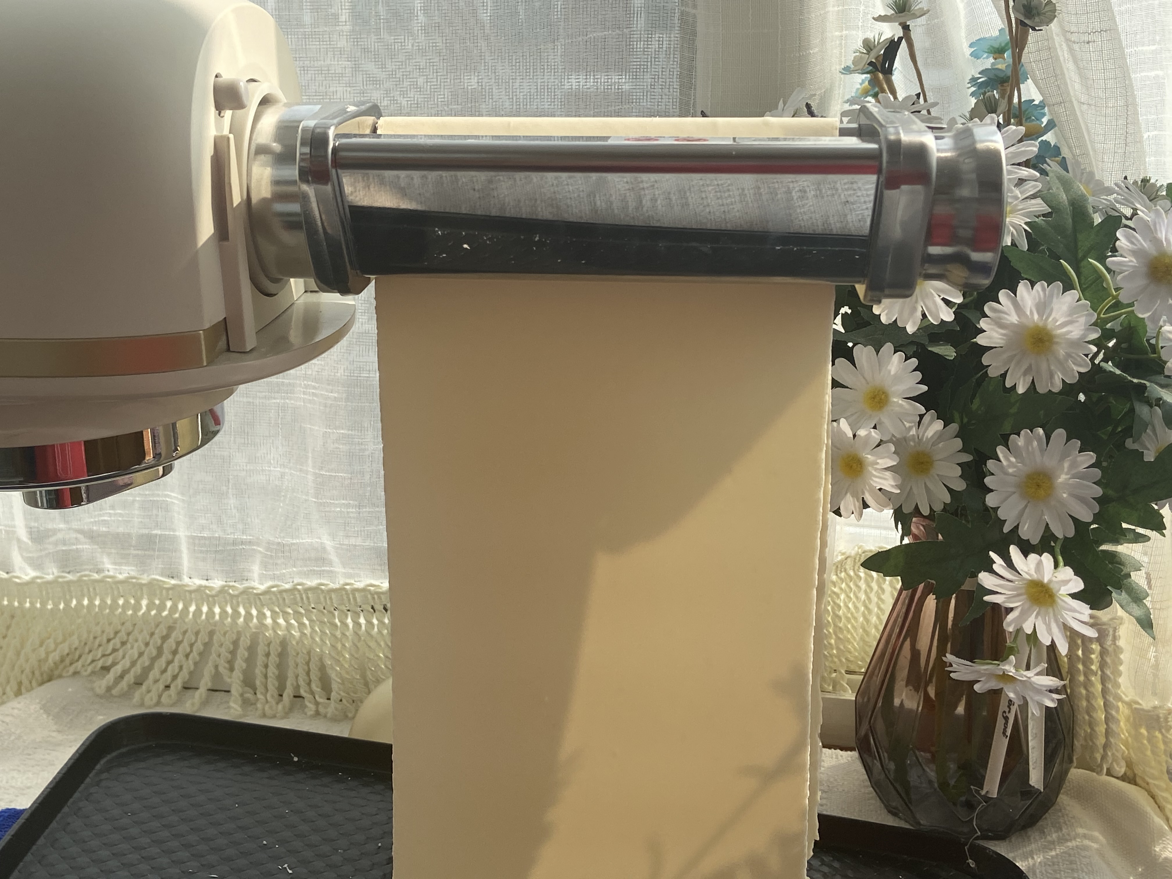 2.厨师机机头拓展部位安装压面机,用擀面杖把面团简单擀平,涂抹一点点玉米淀粉。