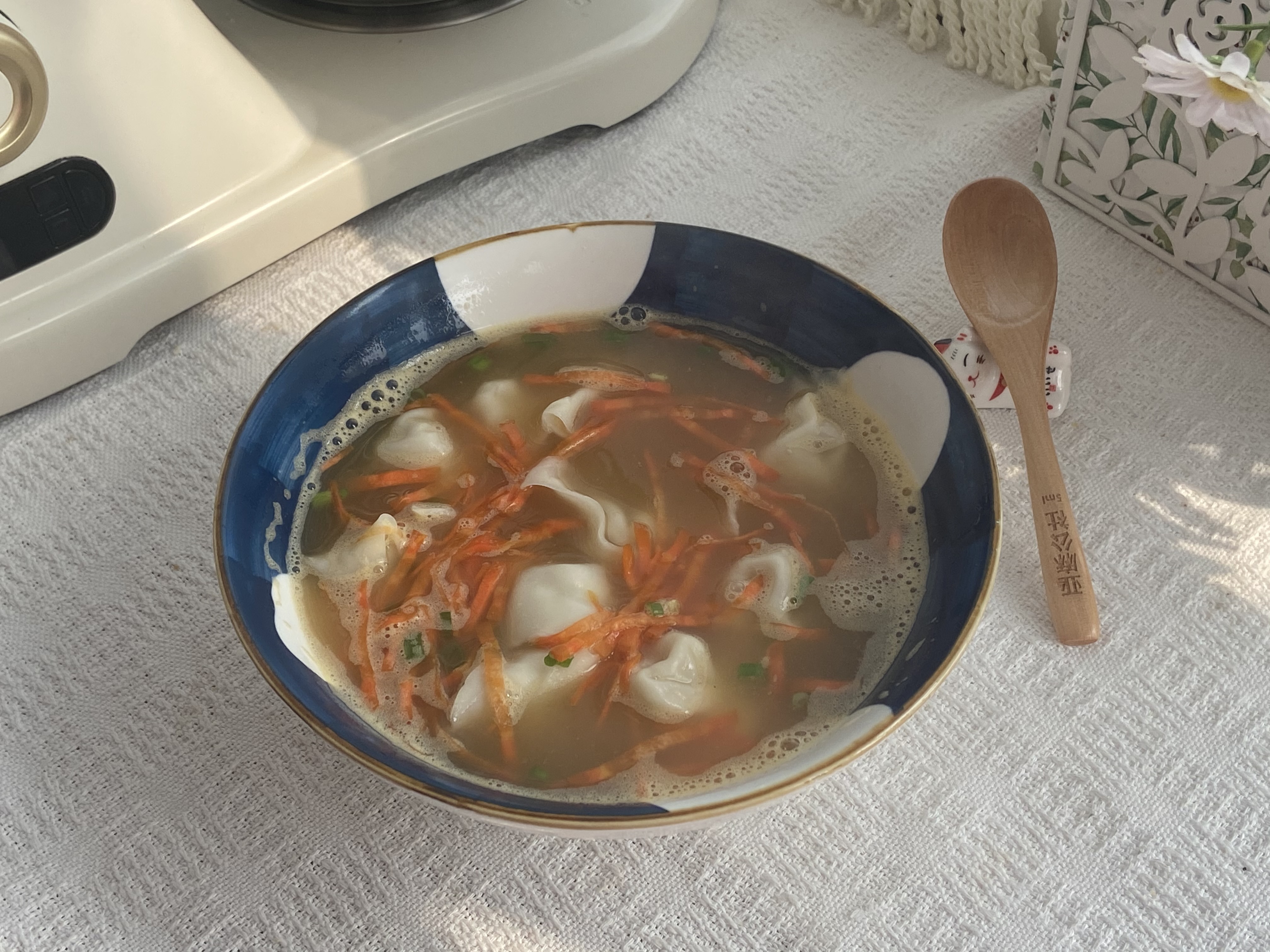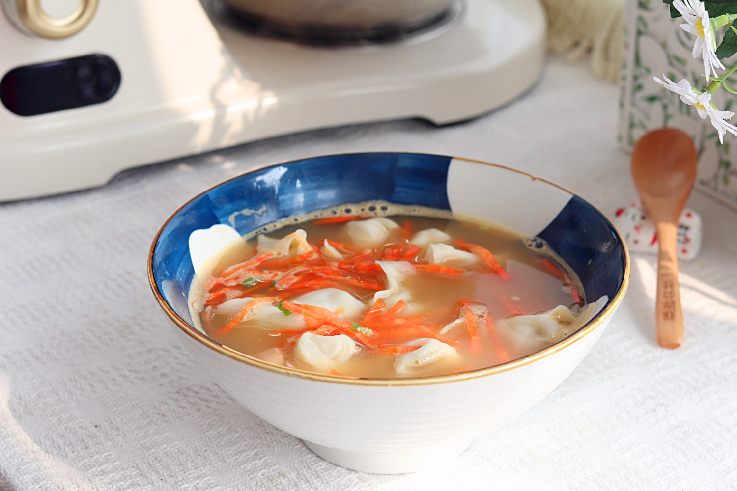 3.汤头的做法很多,这里使用的是一大碗清水,添加一勺高汤、胡萝卜丝、葱花、盐煮沸即可。