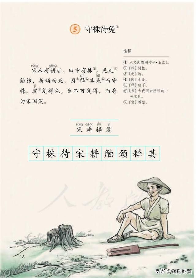 初读这个故事的时候,我也是一个小学生,当时还真的挺羡慕这位“宋人”的,因为他轻而易举地捡到了一只兔子,心想:我要是也有这样的好运气,该多好啊!甚至一段时间里,放学的路上,远远地看到一棵就会特别注意,看有没有撞死的兔子或者其他什么东西。