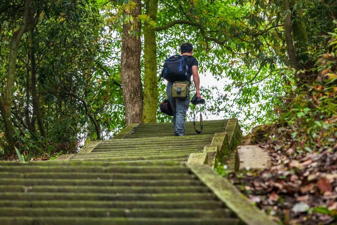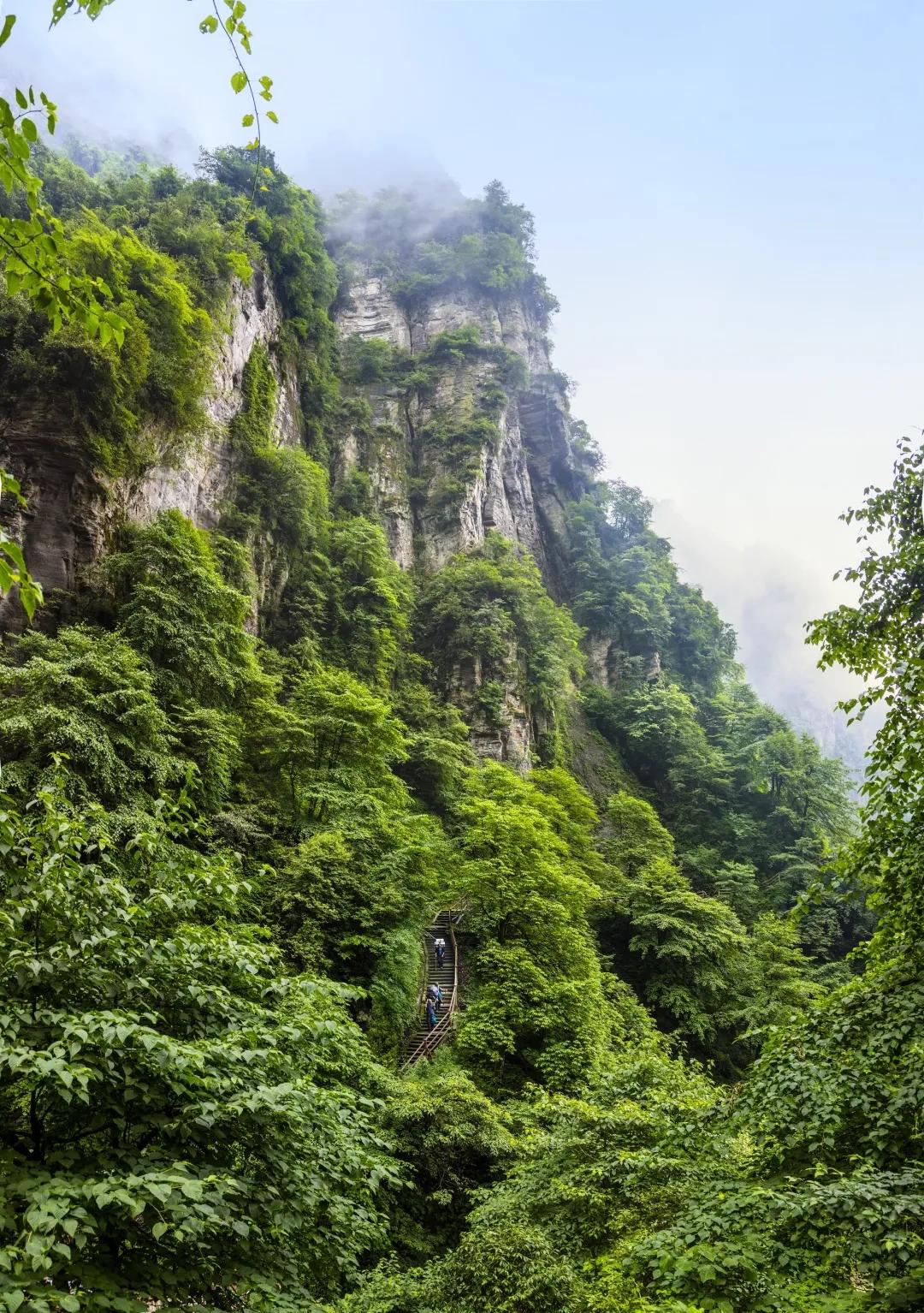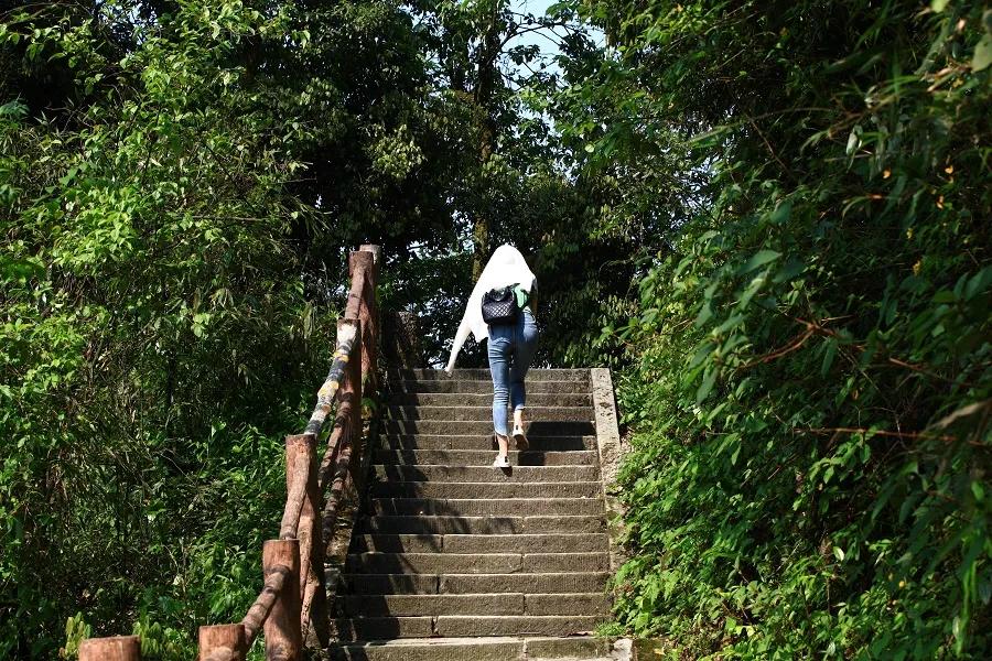 沿着悬崖绝壁上的“之”字形石级向上攀登
