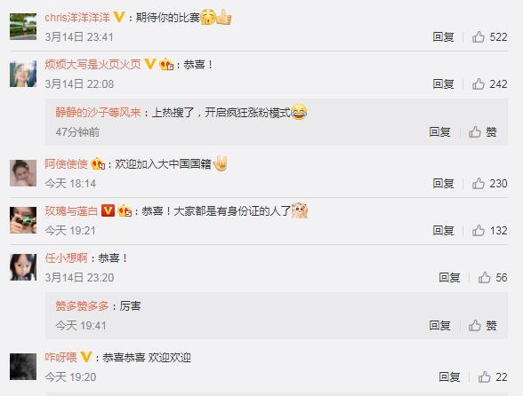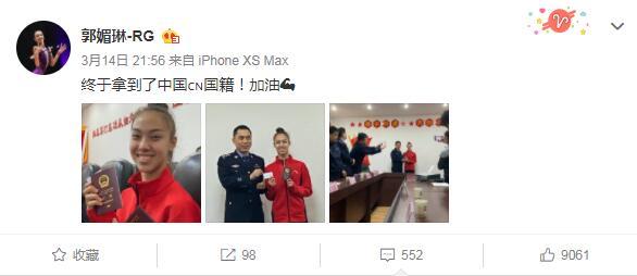 郭媚琳在微博上宣布自己获得了中国国籍,网友纷纷送上祝福。