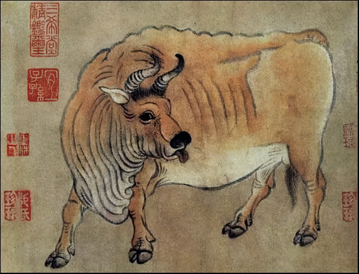 《五牛图》是为数寥寥的几件大唐纸绢绘画传世真迹之一,画中的五头牛,各具姿态,或吃草,或翘首面驰,或纵蹄而鸣,或回顾而舔舌,或缓步而趾行,神情生动,准确地勾勒出牛的体态结构。