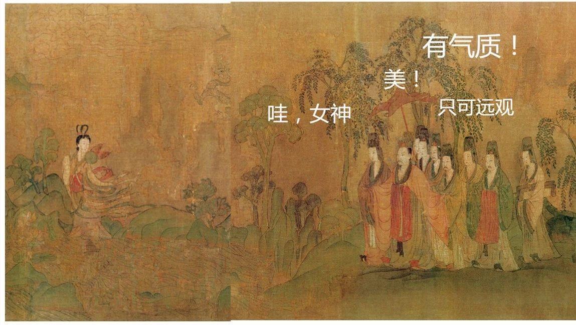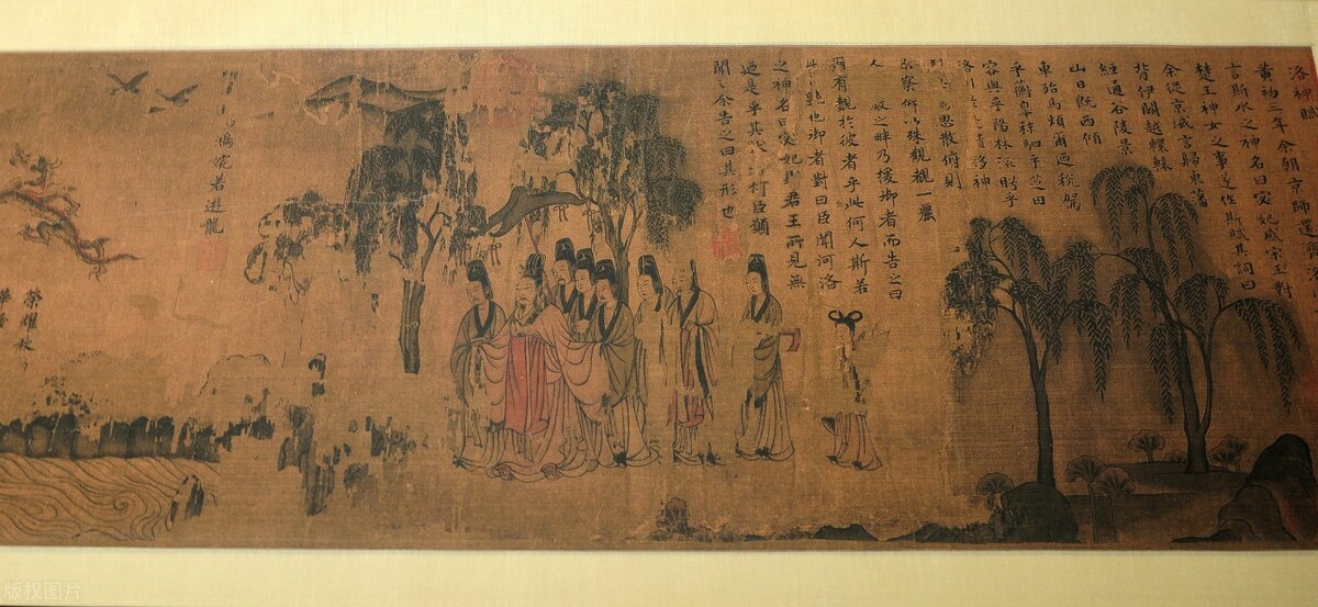 《洛神赋图》是东晋画家顾恺之以曹植《洛神赋》之意而绘,原卷已失,现为宋摹本。长卷描绘曹植初见洛神,情意绵绵,但终究人神殊途,不得不离别;洛神乘云车向远方驶去,曹植乘轻舟溯流而上追赶云车,恋恋不舍。