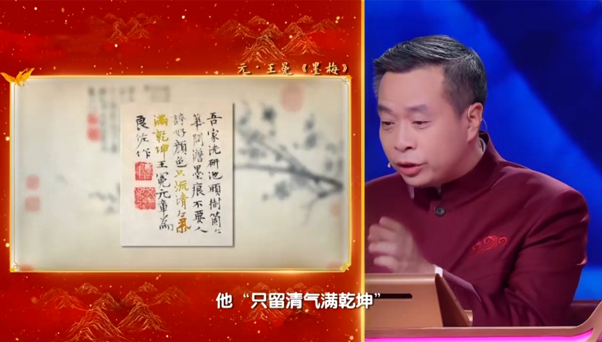 康震老师在进行点评时说,王冕其实画了很多幅墨梅,并在每一幅上都题了《墨梅》这首诗,导致这首诗有不同版本,比如“只留清气满乾坤”和“只流清气满乾坤”,故宫博物院就有一幅王冕的墨梅图,题诗最后一句用的是“流”而不是“留”。