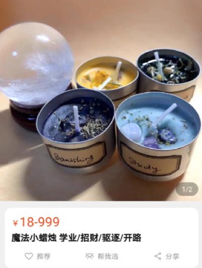 一个魔法蜡烛,卖18-100元不等,你可以选择自己想要提升的方面,如招财、疗愈、学业、桃花等,不同方面价格各不相同。