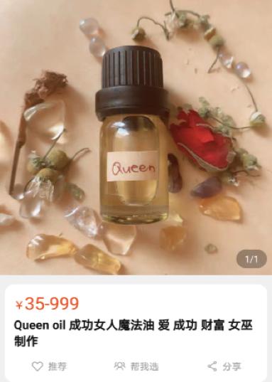 一个魔法油,商家号称是手工魔法制作,会释放出能量。所谓的金钱回来魔法油、疗愈魔法油、成功女人魔法油、幸运魔法油等,价格32-52元不等。