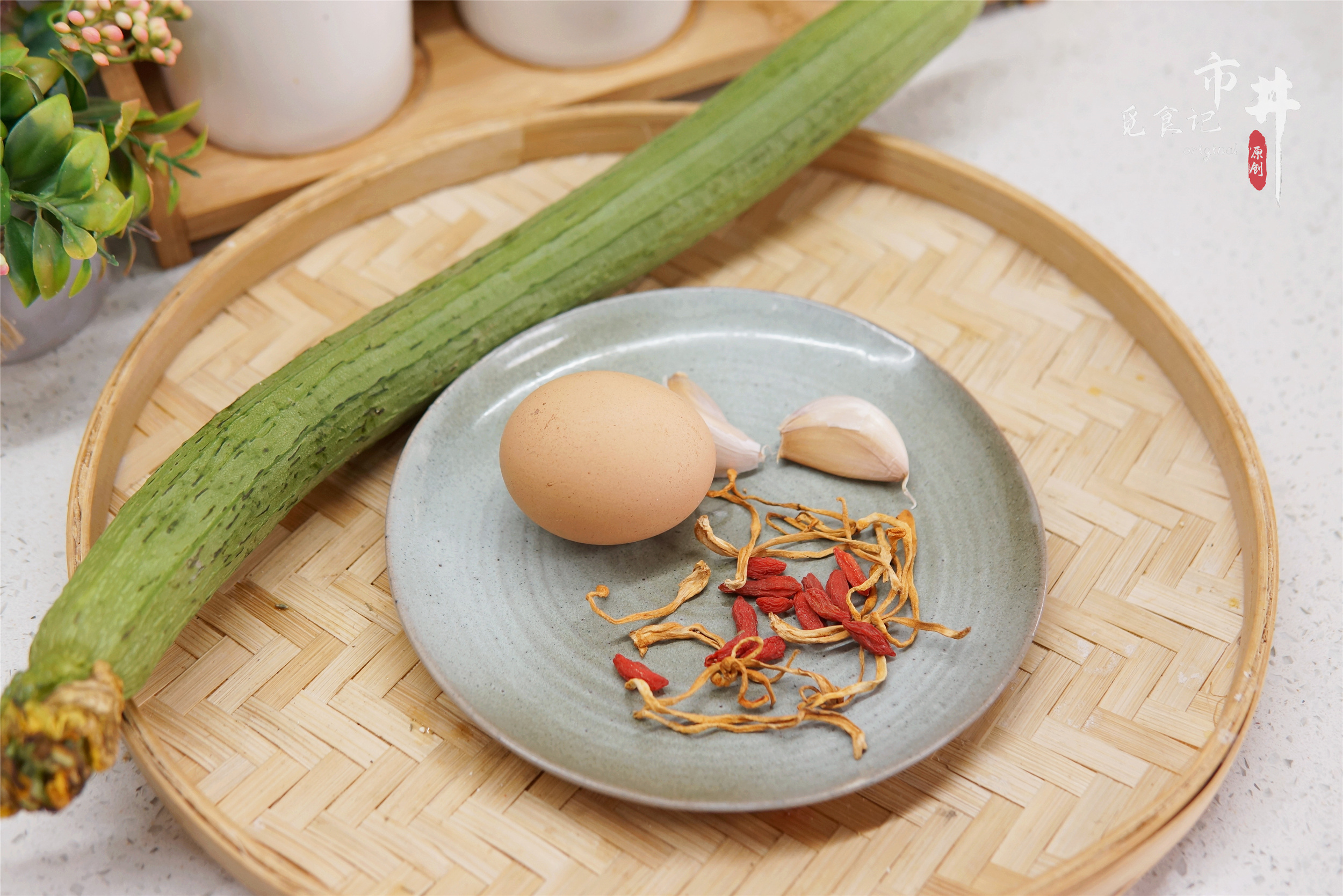 所需食材:丝瓜1根,鸡蛋1个,虫草花1小把,枸杞5颗,盐适量,大蒜2瓣。