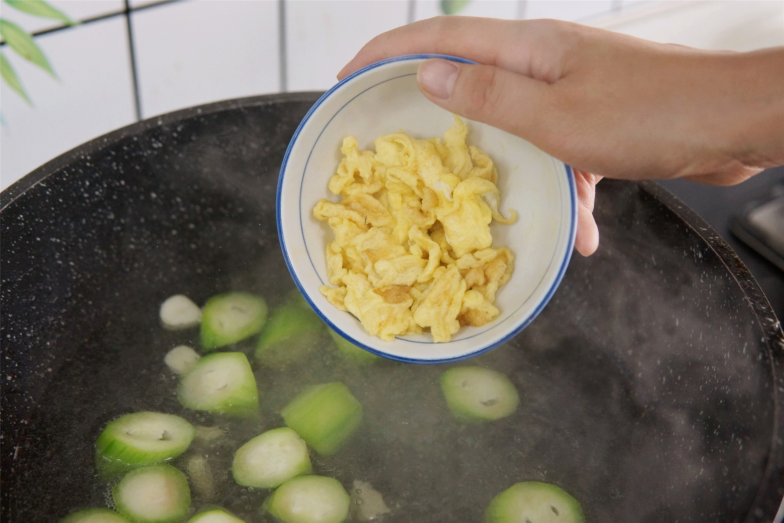 小贴士:这里的丝瓜做汤主要以“鲜”为主,鸡蛋的鲜和丝瓜的鲜足以,因此不需添加生抽、蚝油等调味料,影响汤色还会抢了丝瓜的清香味道。