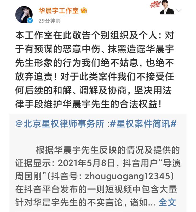 近日在某社交平台出现了关于“华晨宇其实还有一孩子……”的造谣,严重影响到了华晨宇的个人声誉,并且侵犯了他的名誉权。并且表示不接受任何后续和解,调解和协商,坚决总法律手段维护合法权益。