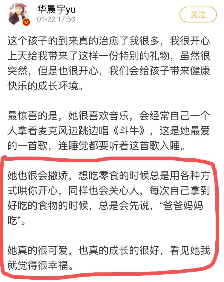 通过1月22日华晨宇在社交平台发布的文章便可以感受到,他是一个好爸爸,一个有责任有担当的好爸爸。提到“它真的很可爱,也真的成长的很好,看见她我就觉得好幸福。”他发现女儿很喜欢音乐,很会撒娇,哄大人开心,点点滴滴的用心观察,都是来自一位爸爸的爱。