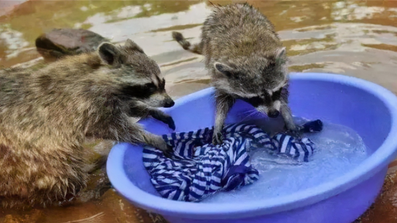 其实不然,小浣熊的爪子上有很多的感知神经,它们清洗东西的行为其实只是为了确认手上的东西到底能不能,而水能帮助它们收集更多的感官信息。