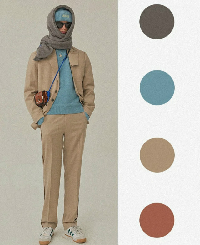 杏色+墨灰色采用1:1配色是最基础不容易出错的。可以上装杏色,下装墨灰色,也可以上装墨灰色,下装杏色搭配。