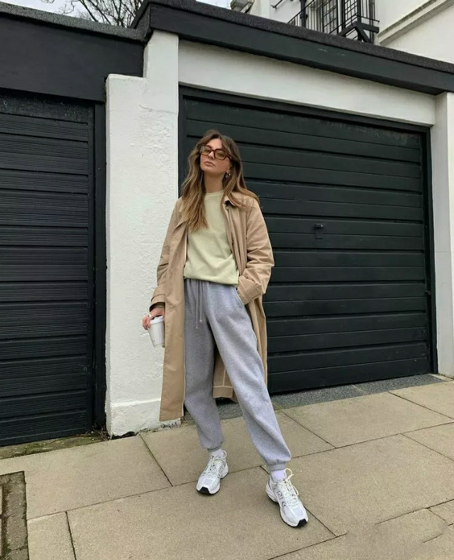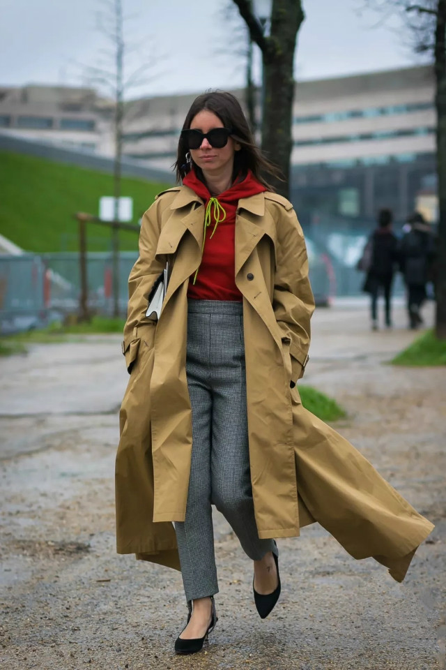 红色和墨灰色撞色沉稳大气中带着热烈感,卫衣休闲,烟管裤沉稳优雅,两者混搭超级欧美范儿,再来上一件杏色风衣,简直太高级了。烟管裤更适合选择高腰、露脚踝的款式。