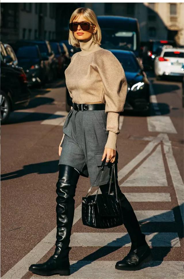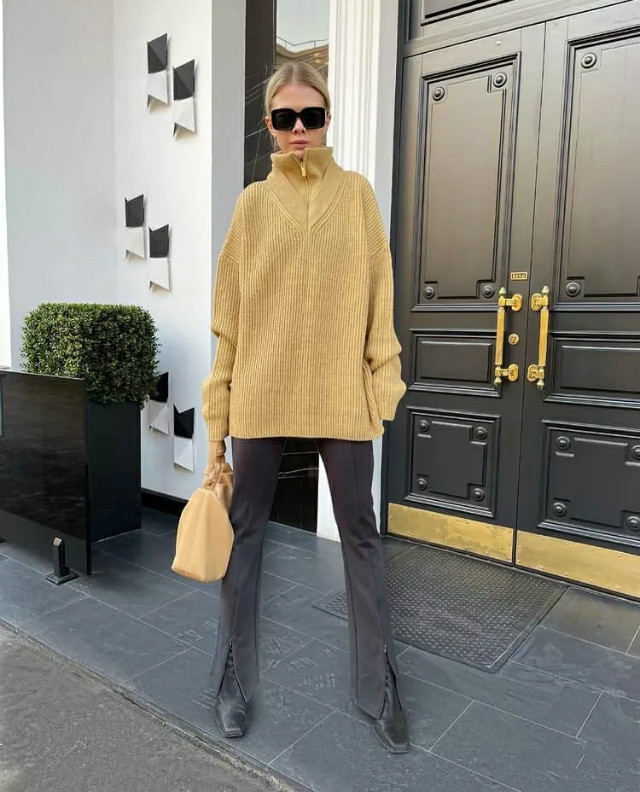 偏奶油色调的杏色毛衣和高领毛衣叠穿,丰富有层次感。选择竖条纹织法的毛衣还有显高的效果呢!上宽下紧配上墨灰色喇叭裤,摩登又现代,超有春天氛围感的一套搭配。
