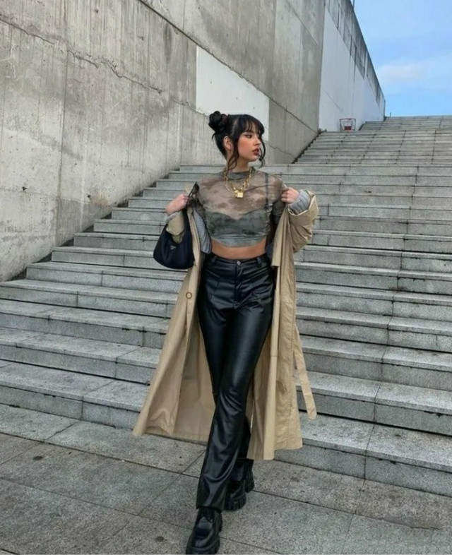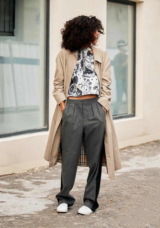 风衣选择长款和中长款比短款穿起来更有气势。西装裤选择墨灰色比黑色更活泼减龄,比普通的灰色更有质感。上繁下简内搭黑白印花露脐上衣,高级时髦的穿搭你值得拥有!