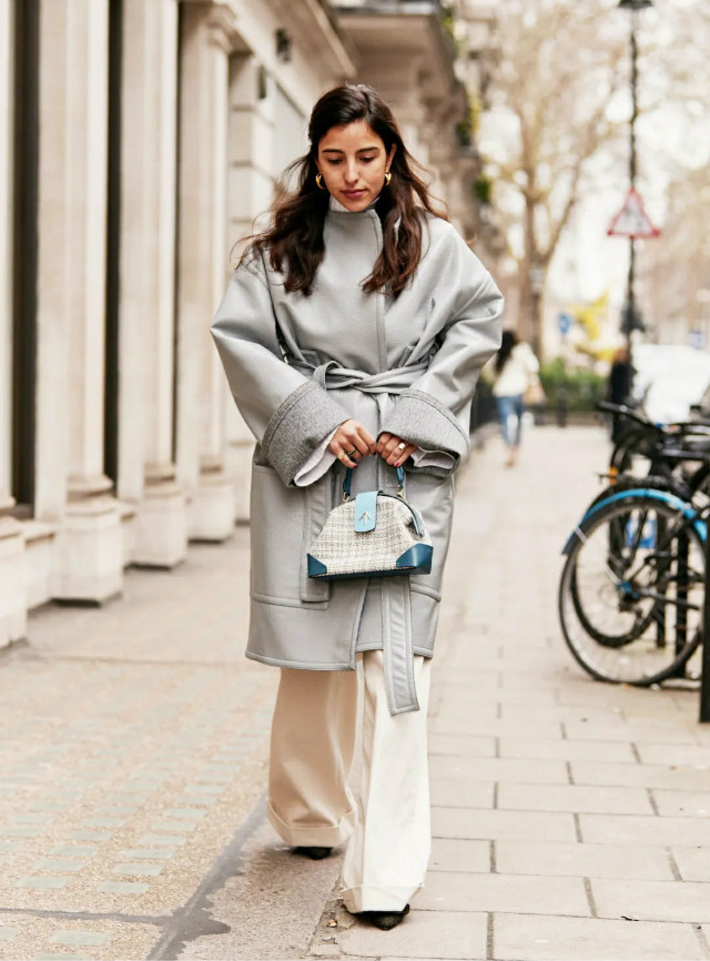 墨灰色薄款大衣很适合还有一定寒意的地区。宽松长款大衣用上系带穿法一点都不会显得臃肿。搭配浅杏色拖地阔腿裤,配上金色耳饰作为点缀,优雅高级。
