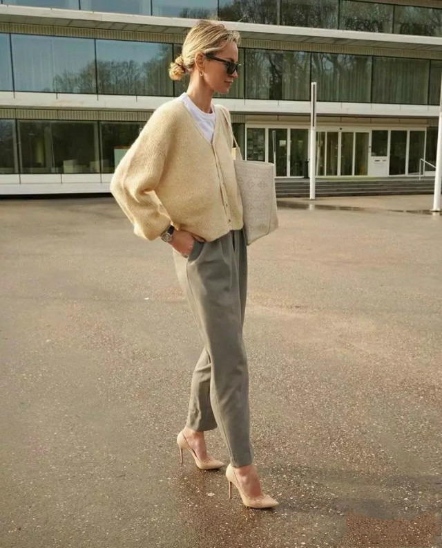 “杏色+墨灰色”搭配时,用上松紧结合(上宽下紧、上紧下宽)超级显身材;用简繁结合(上简下繁/上繁下简,外简内繁/外繁内简)搭配更有层次感;用撞色搭配吸睛个性,比简单的杏色+墨灰更出彩。