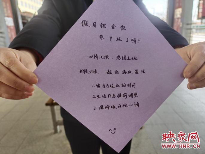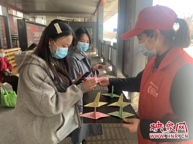 “你们的这个创意真的很不错,千纸鹤代表的是祝愿,是吉祥如意的象征,同时,你们又在上边写满了怎样应对‘节后综合征’的方法,真是太暖心了。”刚下车的董女士对志愿者王娟说道。
