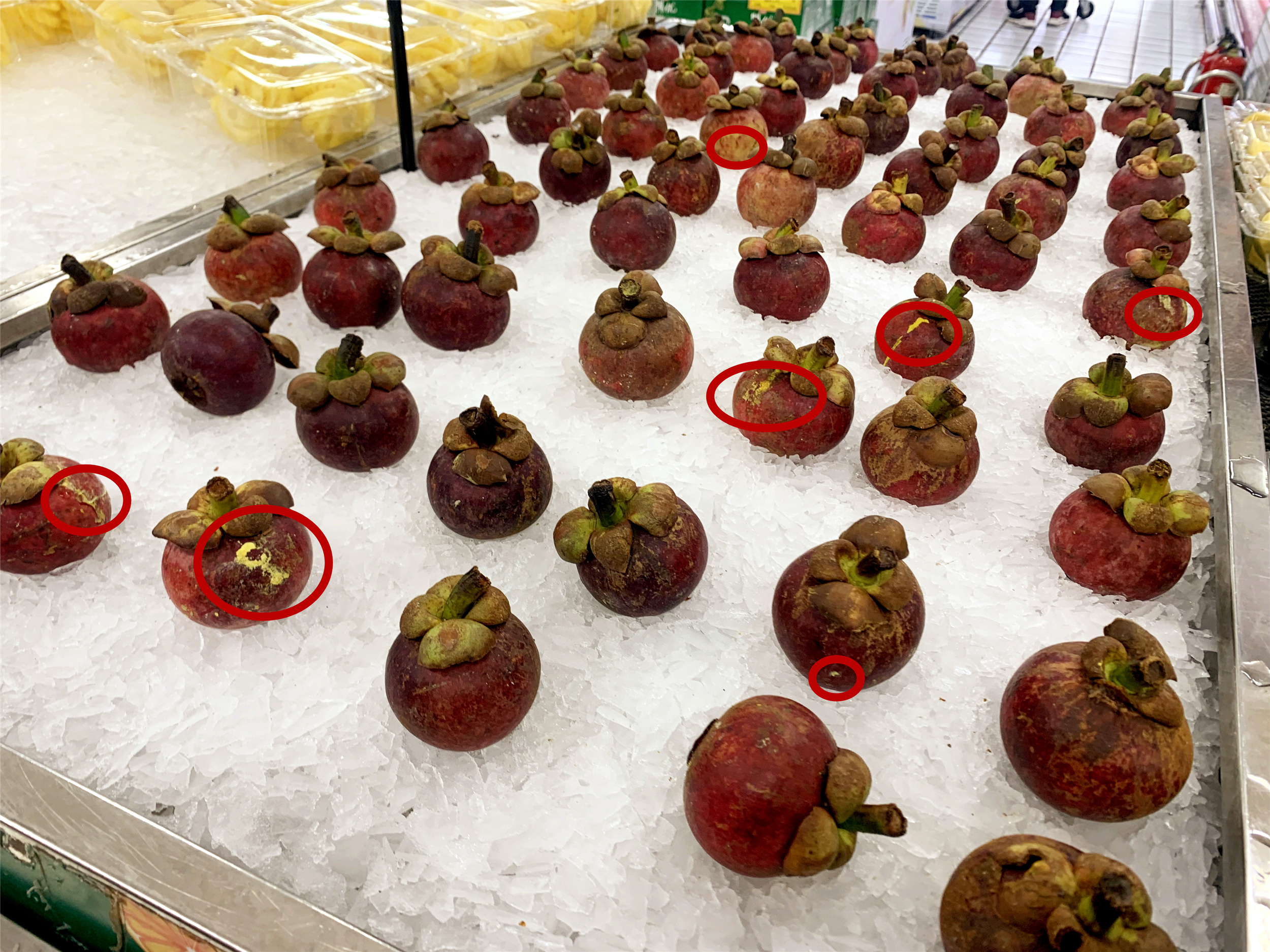在购买山竹时,有时我们能看到山竹外皮上附着着黄色的物质,卖山竹的商贩可能会说,这是山竹质量好才会分泌出来的粘液,就像芒果一样由于甜才会流出“蜜汁”,其实不然,这黄色的分泌物是采摘或运输的过程中,山竹受到损伤、挤压或放置时间过长而流出的粘液,是不利于山竹保存的。