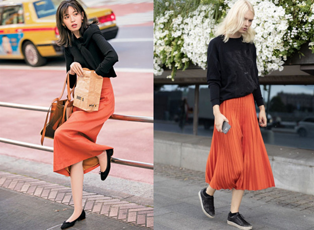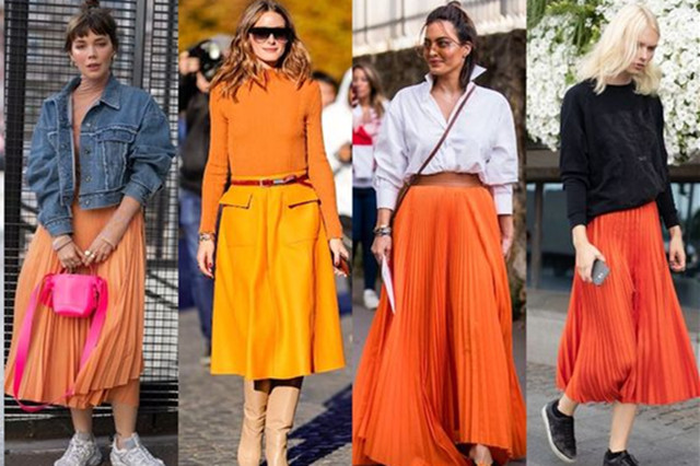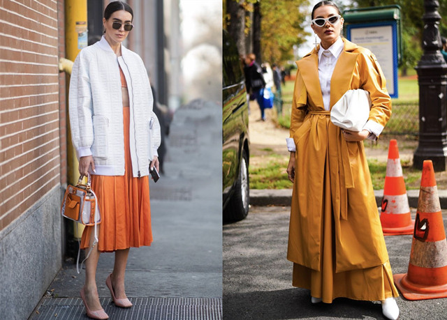 左图:明亮的橙色百褶裙与纯白色外套相结合搭配,增加了鲜明的色块,并且很时尚。一双方趾高跟鞋体现了现代感。