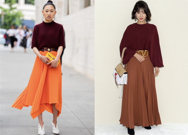 深色的波尔多酒增加了熟女的气质,与橙色相结合搭配,营造出别致的外观。百褶裙线条的流畅,呈现优雅。波尔多的高级感,无论是亮色的橙色,还是暗色的橙色,都是很好的配色,不温不火的色彩,达到恰到好处的时尚感。