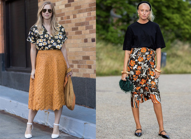 左图:橙色喇叭形裙摆搭配黑色花卉衬衫。花卉图案还包含橙色,因此可以从上下的颜色中取得和谐,也可以享受整体的协调感。
