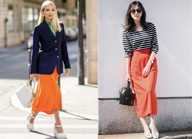 将其与高级的灰色搭配,可立即将生动活泼的橙色裙子变成时尚。若想在黑与灰色的穿搭时显得别致,建议采用色彩来搭配。