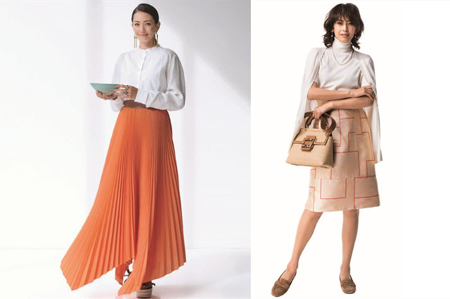 右图:长款外套与长裙子的协调搭配得相得益彰。如果将其与白衬衫及白色包、白色鞋子结合搭配,尤其是白色鞋子,使脚边不会沉地的感觉,增加了轻盈感,并且心情会大大改变。