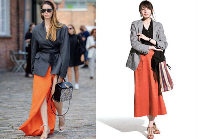 灰色西装与橙色裙子,亦休闲亦正装,也能符合办公室的穿搭。