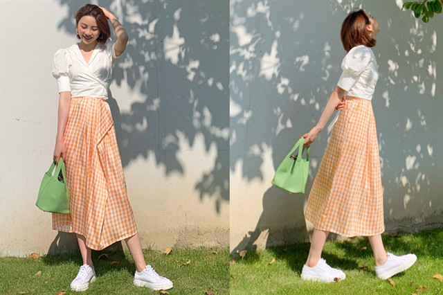 这款橙色与白色格子的裙子,搭配白色上衣与一双小白鞋,瞬间有减龄的效果。灯笼袖与斜襟短上衣的设计感,时尚又优雅。配搭一个绿色包,轻松完成度假风的搭配!