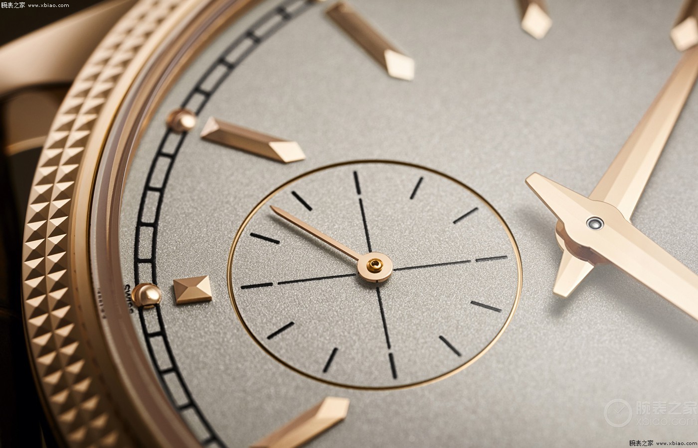 6119两个型号,盘面颜色和处理方式不同。白金6119G是黑色拉丝盘面,小秒针盘面有唱片纹装饰。玫瑰金6119R是白色(蛋白色)颗粒质感盘面,小秒盘和主体盘面保持一致。在盘面布局上,老款3919、5119都是使用柳叶指针、印刷的罗马字时标。新款6119变化非常大,使用剑形太妃指针、立体炮弹字时标。太妃针上有3个切面,炮弹字时标上有4个切面,这样在光线下,会非常闪。6119的另一个细节,在盘面外圈增加了轨道刻度。并在对应时标的位置,有立体的小圆点。整体盘面的风格,偏向于复古。