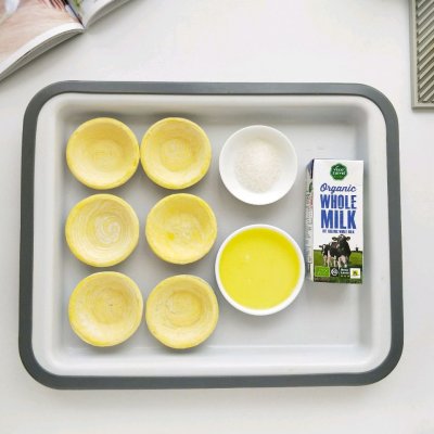 2、将蛋清、牛奶、白糖混合搅拌均匀制成蛋挞液,追求细腻口感可以再过一次筛,接着将蛋挞皮放烤盘中,将蛋挞液倒入8分满即可。