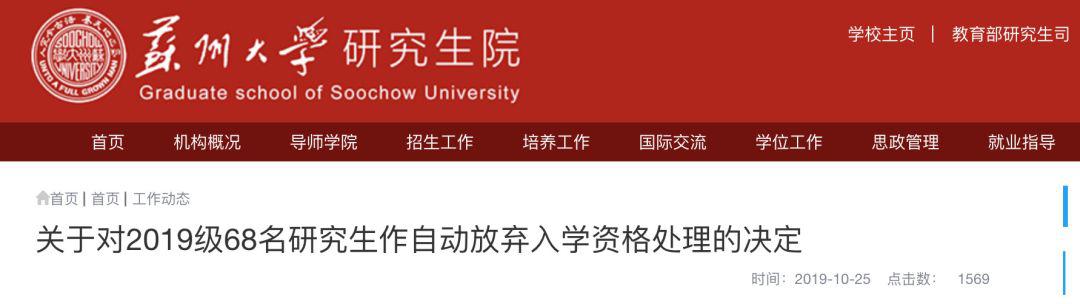 而2019年10月25日,苏州大学研究生院也表示,该校68名2019级研究生因未按学校规定办理入学手续,经学校审议,对他们作自动放弃入学资格处理。