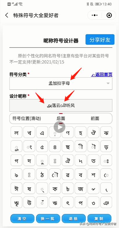 3:当我们选择好了泰米尔符号之后,我们可以继续选择其它类型的符号,在昵称符号设计器里面,有非常多的个性符号,可以根据我们的爱好来选择就可以了.接下来增加孟加拉字母来设计,这里有非常多类似于爱心的符号,非常漂亮,我们把他加到字的中间