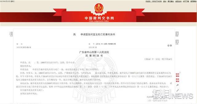 2015年5月18日,失踪了2046天的何堃玉在其丈夫高亮的申请下,被当地法院宣告死亡。
