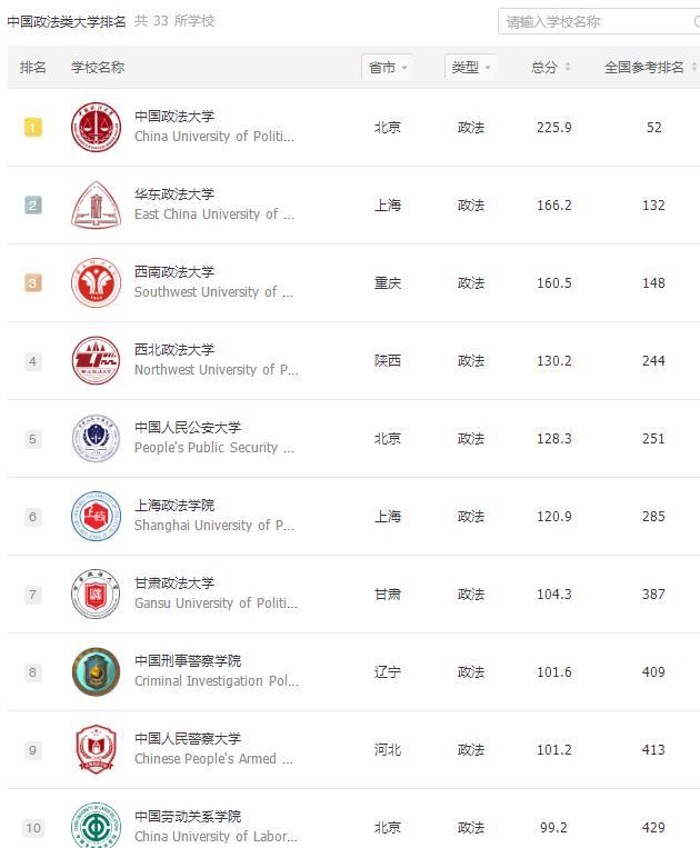 如果想要在高考中填报政法类大学,我们到底有哪些比较好的选择呢?最新公布的软科政法类大学排名10强榜,为我们梳理了中国10所实力最强的政法类大学的排名。现在,就让我们来看看这个排行榜。