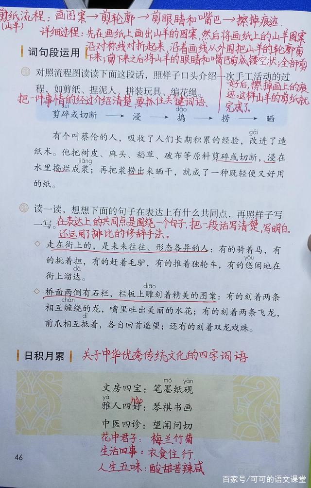 1. 这道题考查的是我们的口头表达能力。把一件事情的经过介绍清楚,抓住关键词语。 出示的这段文字写的是蔡伦的造纸术如何实施,重点突出几个动词,把主要环节介绍清楚。