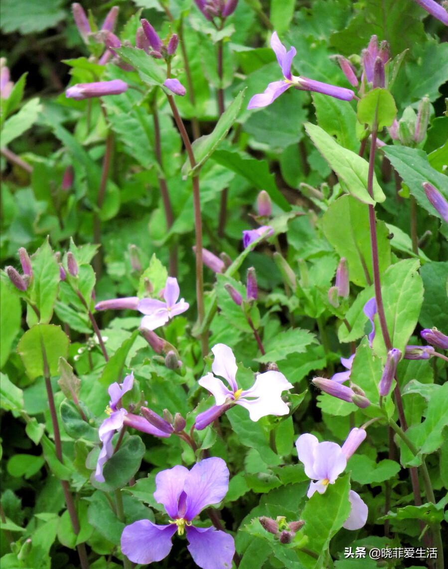 诸葛菜,又叫紫金草、二月兰(二月蓝),一年或二年生草本植物,直立,浅绿色或带紫色。花期4-5月,花紫色、浅红色或褪成白色。