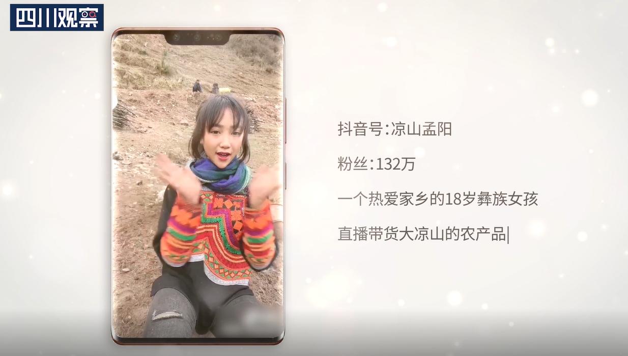 抖音号“凉山孟阳”,截至目前粉丝数132万,孟阳通过抖音短视频和直播的方式,在半年的时间就积累了一百多万的粉丝,她在网络上所展示的多是大凉山农村的日常生活。